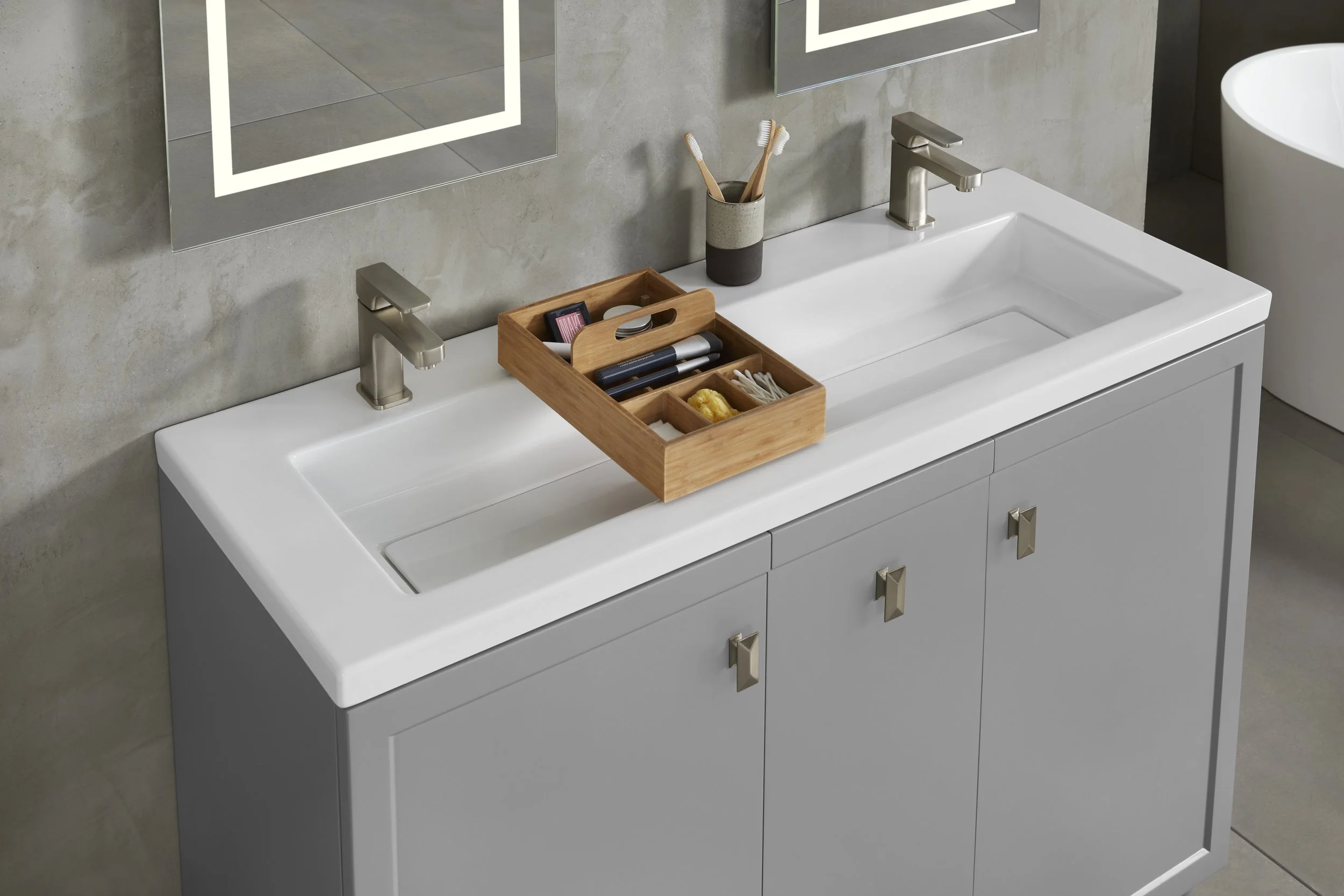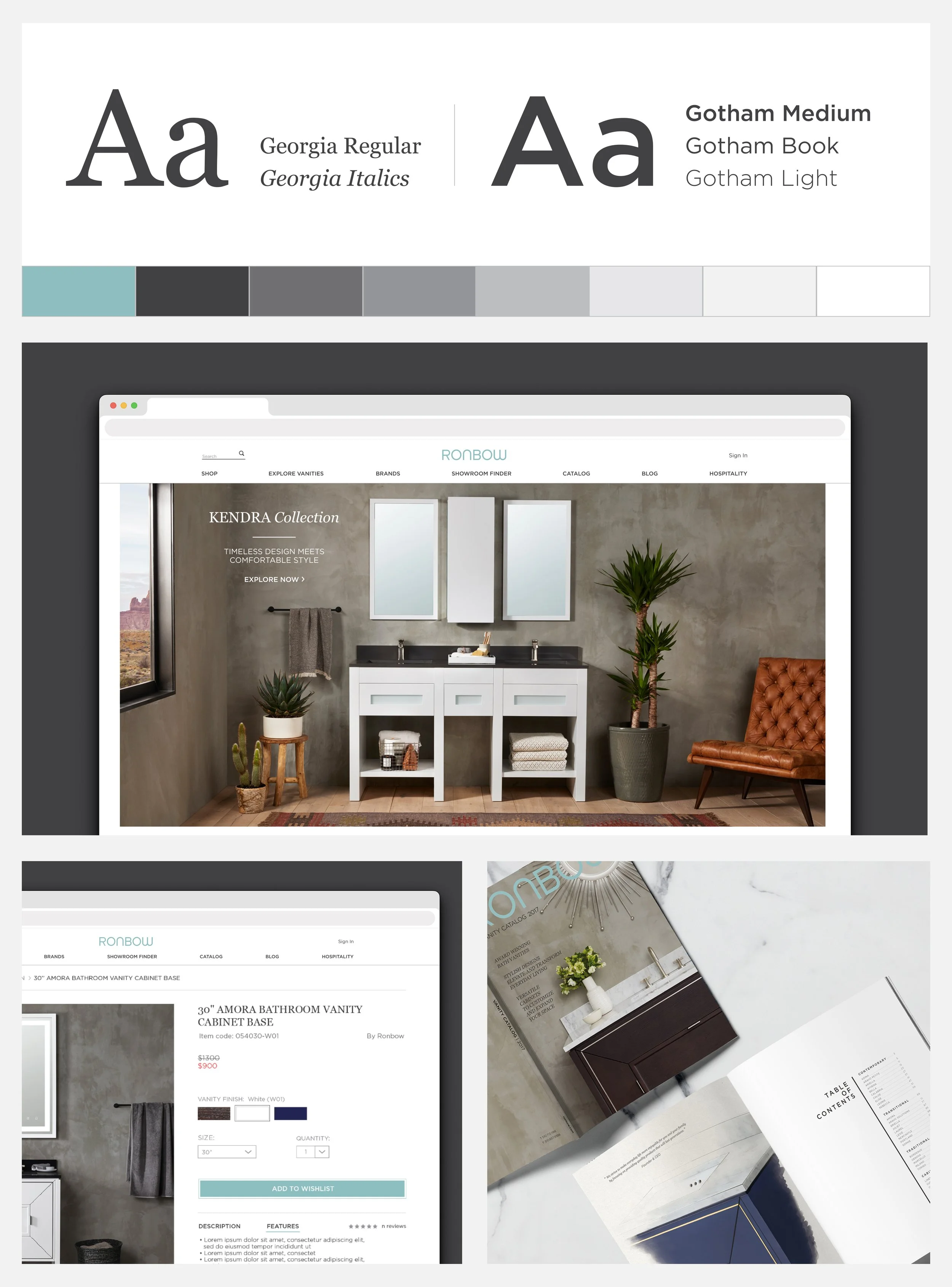 Vanity catalog showcases all the collections, with sizes and finishes available; it also calls out all products in the configurations shown in the picture.